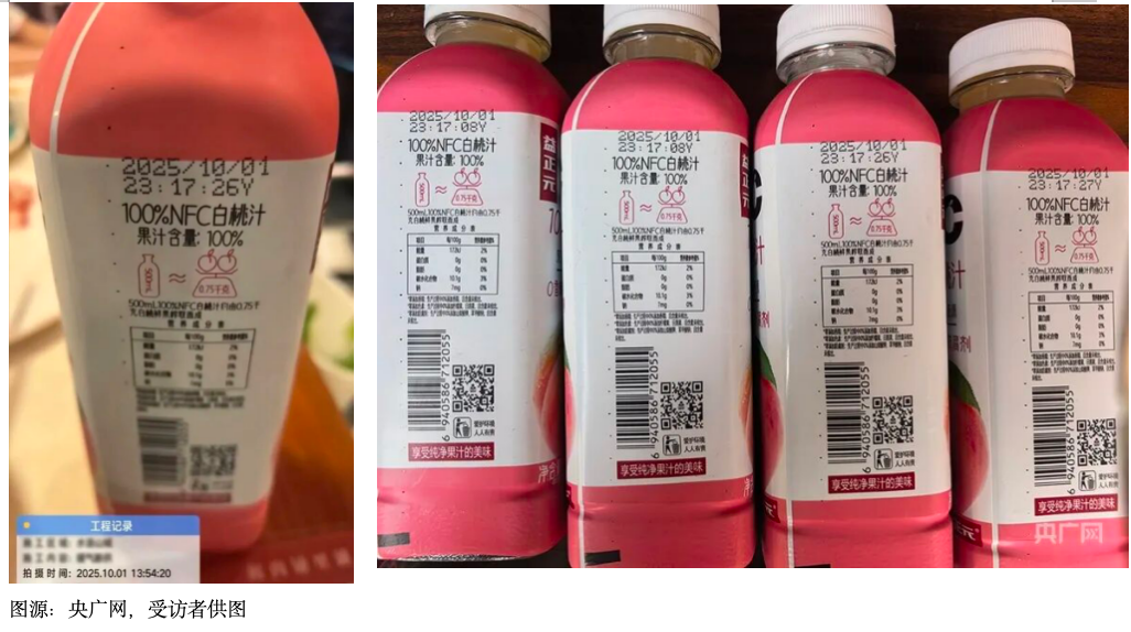 根据报道,北京的消费者在10月1日中午购买了由养力多生产的100%NFC白桃汁产品,发现该产品外包装上所印生产日期为2025年10月1日23:17。而消费者提供的照片工程记录显示,该照片的拍摄时间为10月1日13:54,即消费者在“中午”买到了“晚上”生产的产品。