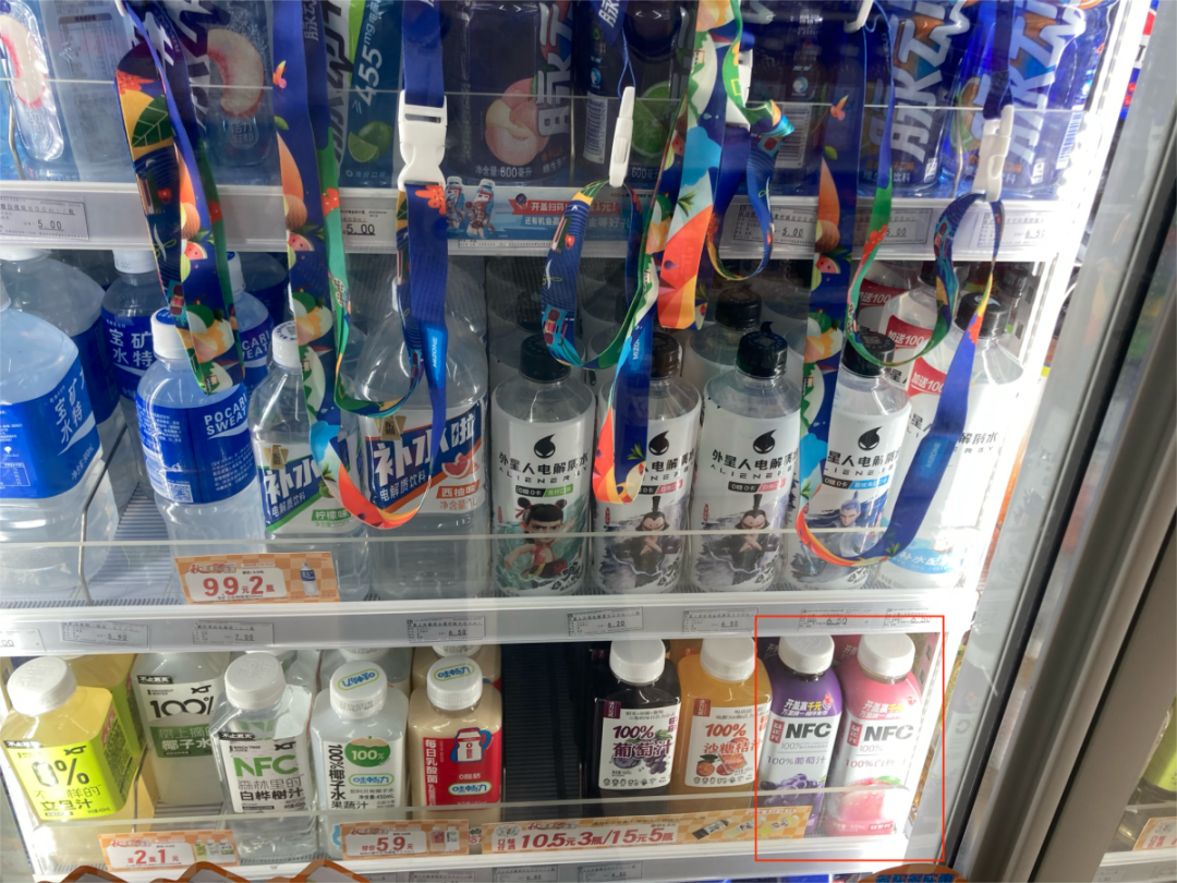 在山东师范大学北门711便利店内,涉事品牌产品仅白桃汁、葡萄汁两款产品在售,产品摆放在中间货柜倒数第二排货架的边角处。售价为7元。白桃汁产品最新日期为2025年8月22日,在冷柜中余量不足十瓶。在问及销量时,店员表示此款商品“卖得比较一般”。